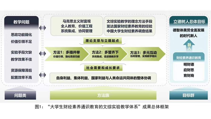 成果坚持立德树人根本,以马克思主义财富观为指导,以“明财德、启财思、育财商”为人才培养目标,充分发挥文科综合实验教学国家级示范中心(以下简称“文综实验中心”)的示范引领作用,历时13年,投入3000余万元,完成35项教研课题、38项教改项目,创新“高效学习”价值工程、“情境嵌入”系统集成、“多元互动”协同管理,创建了大学生财经素养通识教育的文综实验教学体系:以学生为主体,引导其自主形成财经价值观念、掌握财经知识技能;以教师为主导,将最新教研成果转化为学生喜闻乐见的教学内容;以实验为主线,分层式、模块化实现课程思政、通识教育与文综实验教学的有机融合,助学生知学愿学乐学、促教师懂教能教善教。